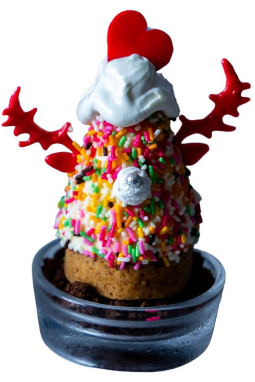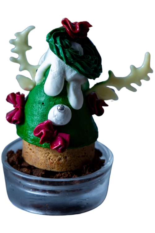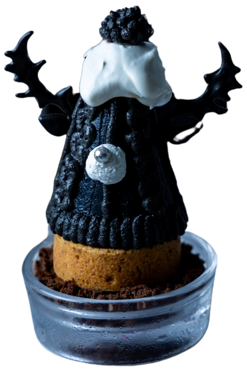 黒胡麻と竹炭でムースを作り、ブラックなニットでスタイリッシュさやエレガントさを表現。中身には、きなこのソースが入っており、黒胡麻ときなこの風味豊かで温かみのある味わいに仕上げました。見た目は、ポップさを表現するため、トナカイの角はあえてリアルな形状に。そこに、シックな黒色のニット帽を合わせることで、遊び心の中に洗練されたかっこよさをプラスしています。